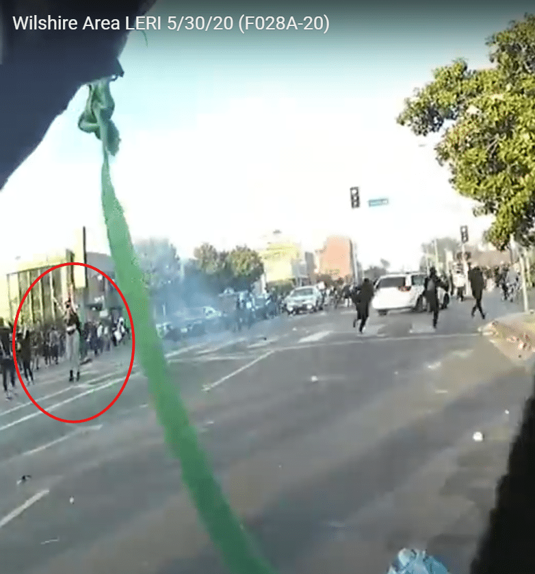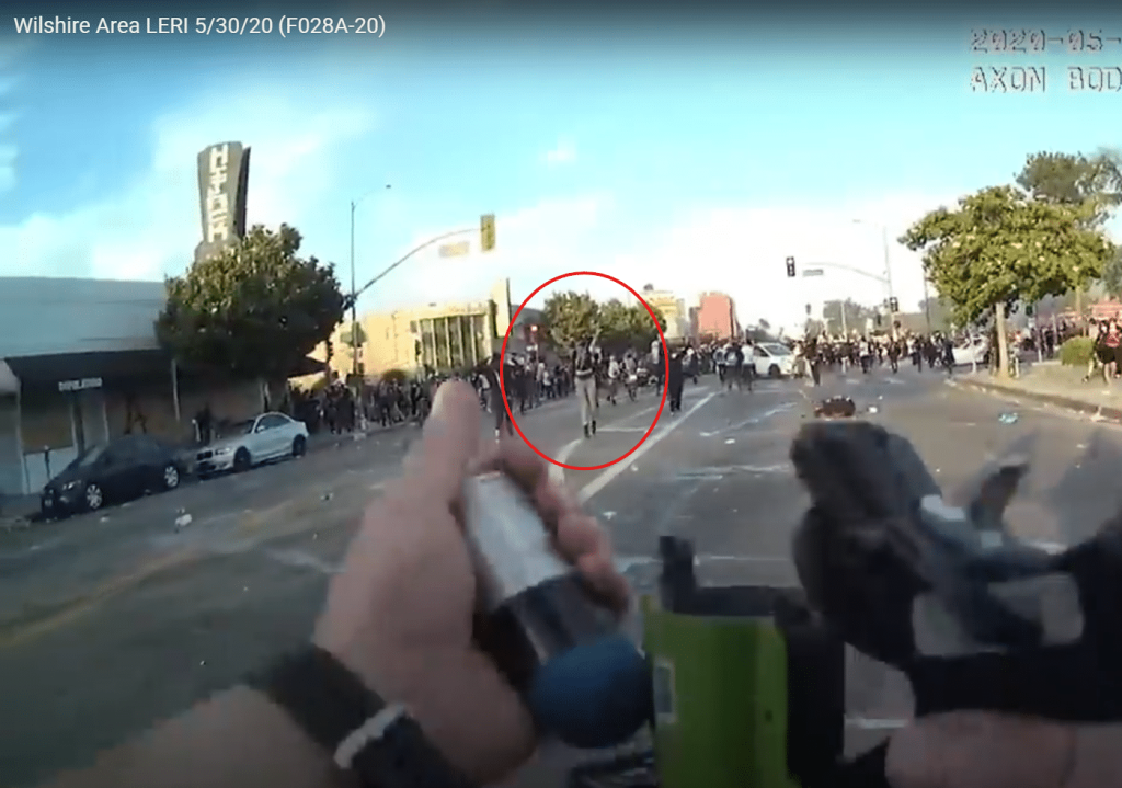 Our client’s peaceful protest was similarly caught by the BWC of another officer in the skirmish line who was carrying a 40mm launcher, another “less lethal” weapon utilized by the LAPD in protest crowd-control settings as follows: